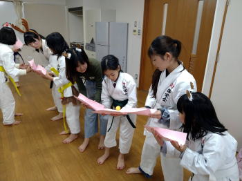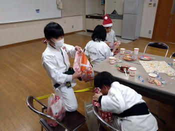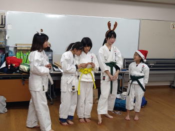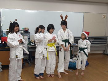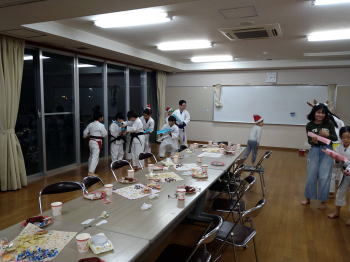 | 城東教室の練習&クリスマス会。 前半は基本稽古、形の演武及び精勤賞(今年1月〜11月、週2回の練習で欠席が5回以下)の表彰。4名が表彰。 後半は恒例のクリスマス会。ゲームとかプレゼント交換等での楽しい時間でした。お疲れ様でした。クリスマス会進行の伊千花さん、ご準備頂いた福井様、福瀨様 ありがとうございました。 =石田教室長= |